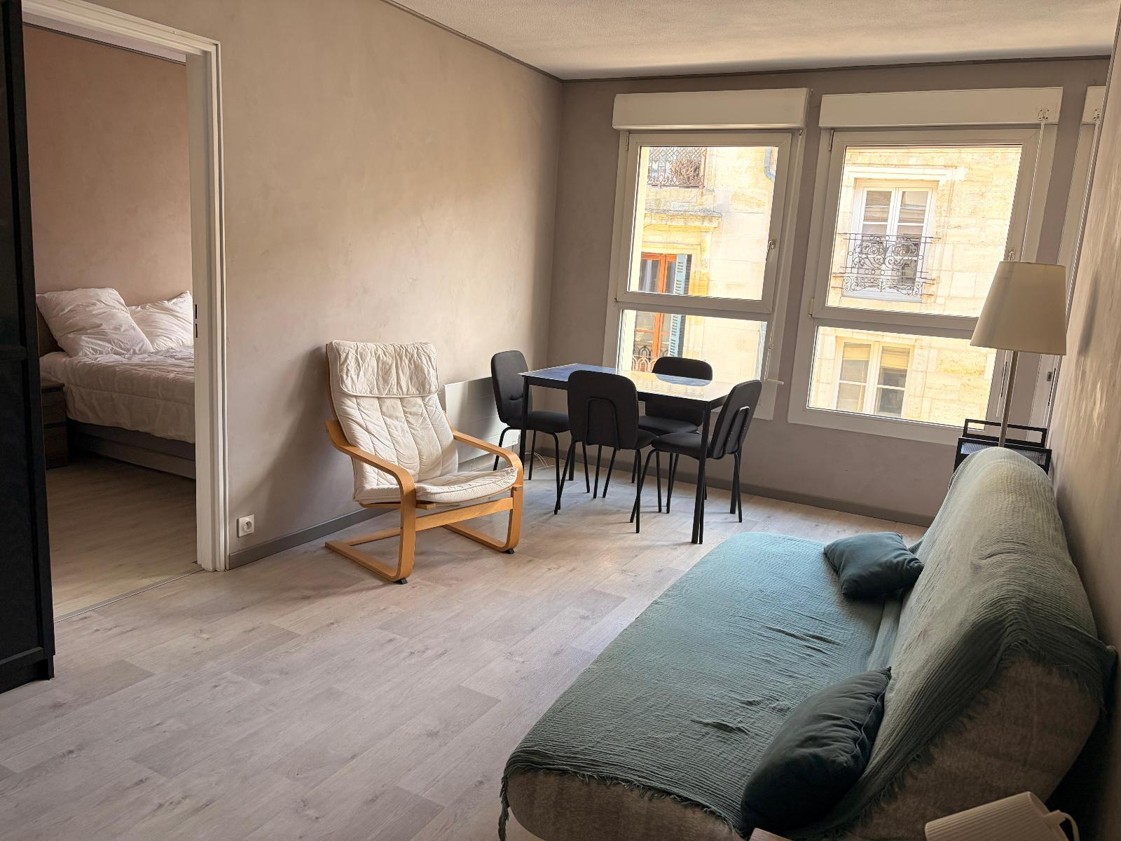 T2 Meublé - Stationnement - Plein centre - Venez découvrir cet appartement meublé situé à deux pas du tram B Musée d'Aquitaine, comprenant une entrée desservant la pièce de vie, une cuisine équipée, une chambre, une salle de bains et des WC séparés. Le logement dispose d'une place de parking dans la résidence. L'appartement est disponible de suite. Le bien est soumis au statut de la copropriété.